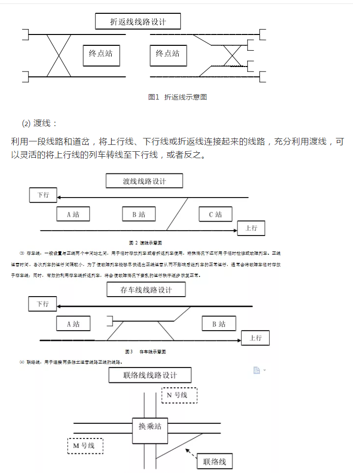 輔助線是為保證正線正常運(yùn)營而設(shè)置的聯(lián)通上行、下行正線的線路,一般包括折返線、渡線、存車線、聯(lián)絡(luò)線、出入段(場(chǎng))線、安全線等。